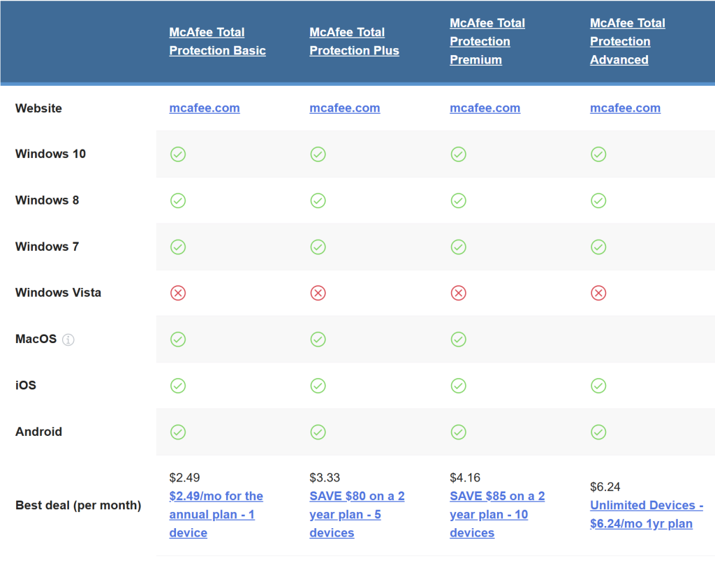 No valueMcAfee Total Protection BasicMcAfee Total Protection PlusMcAfee Total Protection PremiumMcAfee Total Protection Advanced
